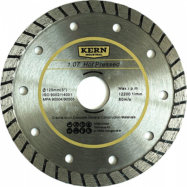 Алмазный диск Kern 1.07 Hot Pressed Turbo 115 мм (Керн 1.07 Хот Прессед Турбо 115 мм) – отрезной сплошной (с гофрированным сплошным алмазным слоем) алмазный круг для сухой и мокрой алмазной резки бетона, кирпича, гранита, а также армированного бетона (железобетона), старого бетона, мостового бетона, промывного бетона, бетонных блоков, базальта, порфира, габбро, сланца, клинкера, бордюрного камня, твердого камня, твердых огнеупоров, тротуарной плитки и других общестроительных материалов. Используется на отрезных и ручных углошлифовальных машинах (УШМ, болгарках).