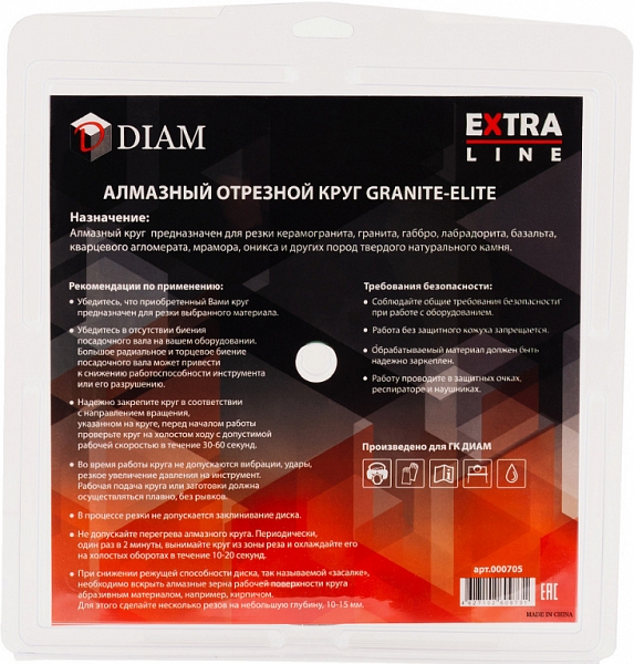 Алмазный отрезной диск Diam Extra Line 1A1R Корона Granite-Elite 250 мм (Диам Экстра Лайн 1А1Р Корона Гранит-Элит 250 мм) – премиальный алмазный круг для мокрой резки гранита, керамогранита, твердой керамики, кварцевого агломерата, оникса, мрамора, габбро, лабрадорита, базальта и других пород твердого натурального камня на бензорезах, электрических резчиках и плиткорезах, камнерезных станках, стенорезных машинах с подачей воды. За долгое время зарекомендовал себя с отличной стороны у многих мастеров, как инструмент, обеспечивающий очень качественное выполнение задач практически по всем твердым материалам, при этом имеет очень большой ресурс и скорость работы.