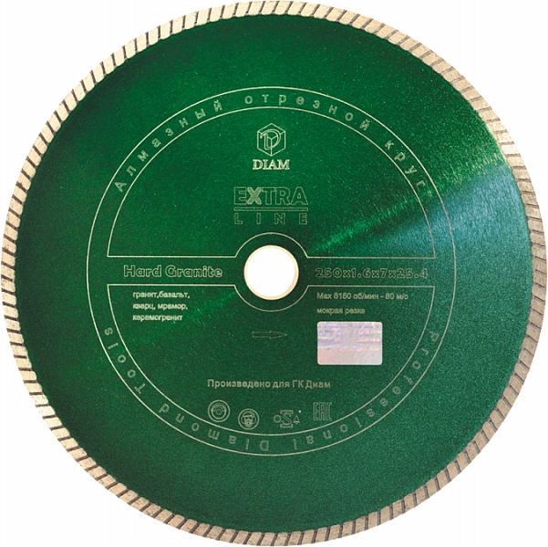 Алмазный отрезной круг Diam Extra Line Turbo Hard Granite 250 мм (Диам Экстра Лайн Турбо Хард Гранит 250 мм) – специальный, профессиональный, тонкий (всего 1,6 мм) алмазный диск с турбированной режущей кромкой тип Turbo для производительной мокрой резки твердой керамики, гранита, керамогранита, базальта, кварца, мрамора, гранитной и мраморной плитки, кирпича на электрических плиткорезах, камнерезных станках, бензорезах, электрических резчиках, стенорезных машинах с подачей воды.
