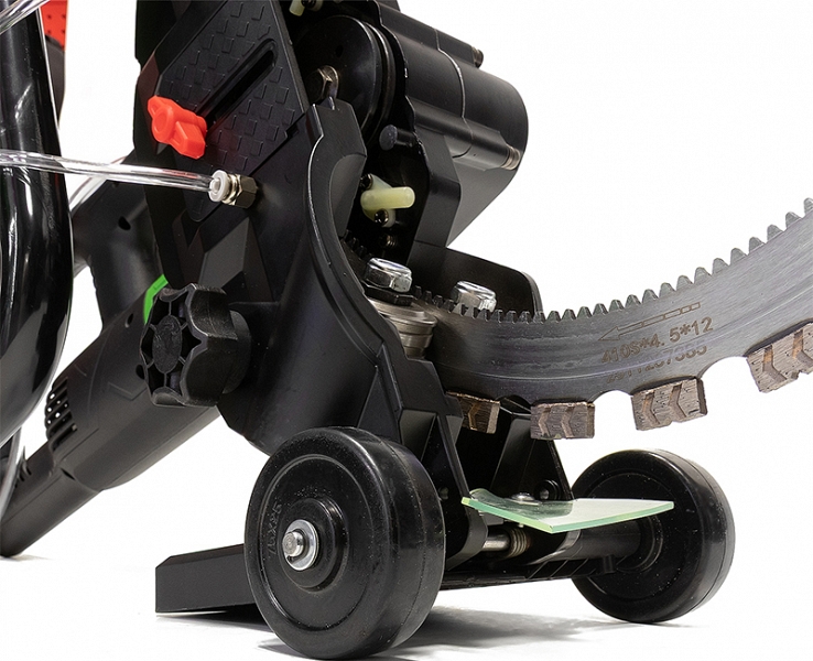 - Антипробуксовочная система: зубья режущего алмазного кольца входят в зацепление с ячейками приводного ролика – это исключает проскальзывание вала при повышенных нагрузках, например, при резке толстостенных труб или материалов с неравномерной структурой