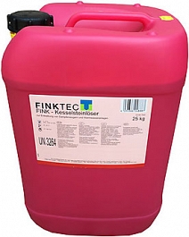 Химическое средство для промывки Finktec FINK-Kesselsteinloser (Финктек ФИНК-Кесселштейнлосер) для кислотной мойки термокамер – замедляющее коррозию средство с биологически активными веществами на основе соляной кислоты, замедлителями коррозии и смачивающими веществами для удаления кальциевых отложений из парогенераторов, паровых котлов и тепловых гидросооружений, раскисление термокамер, камер душирования; для быстрого и эффективного удаления пигментных загрязнений, гидравлической извести, оксидов железа, фосфата кальция и т.д., а также от зарастания биологической пленкой в паровых котлах, тепловых гидросооружениях и для дезинфицирующей промывки систем технической и питьевой воды.