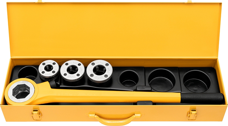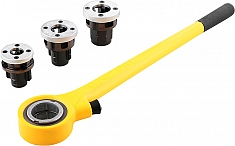 Особо прочный. Высококачественный храповый рычаг изготовлен из стали, покрыт толстым слоем пластика со специальным покрытием, предохраняющим от скольжения инструмента в руке, приятно и удобно держать во время работы. Легко регулируемое направление вращения трещотки. Удобная, надежная посадка быстросменных головок, легко вставлять и снимать. - Быстросменные резьбонарезные головки: