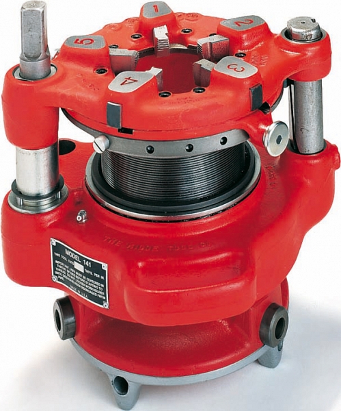 Резьбонарезная голова со ступенчатой регулировкой Ridgid 141 BSPT R (Риджид 141 БСПТ Р) с комплектом быстрорежущих резьбонарезных гребенок High-Speed (HS) предназначена для нарезки правой трубной конической резьбы BSPT R на трубах Ø 2 1/2" – 4" на резьбонарезных станках Ridgid 300, 300 Compact, 300-A с кареткой, 535, 535А, 1233 и электрическом резьбонарезном клуппе Ridgid 700, а также других производителей, в промышленном секторе.
