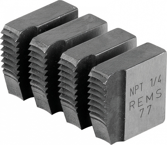Резьбонарезные плашки Rems NPT 1/4" (Ремс НПТ 1/4") предназначены для нарезки правой трубной конической резьбы NPT (Taper Pipe Thread ASME B1.20.1) на стальных трубах Ø 1/4" с применением ручных и электрических резьбонарезных трубных клуппов Ева, Амиго, Амиго 2, Амиго 2 Компакт.