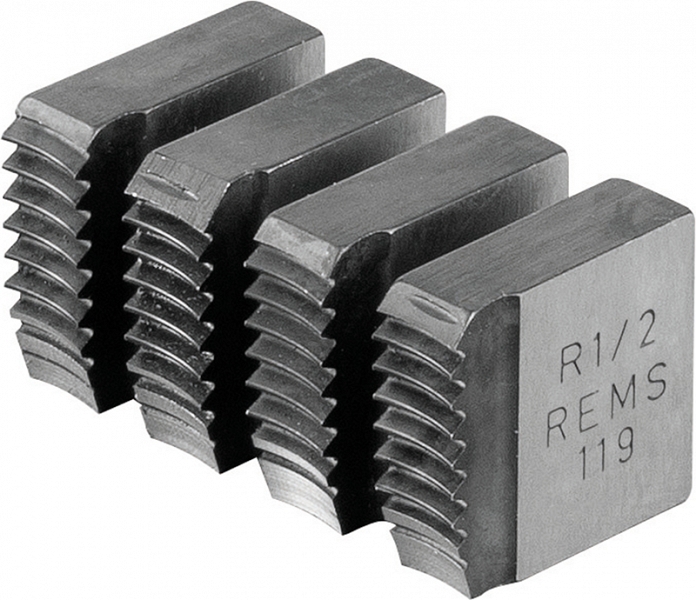 Резьбонарезные плашки Rems R 1/2" (Ремс Р 1/2") предназначены для нарезки правой трубной конической резьбы R (ISO 7-1, EN 10226 (DIN 2999, BSPT)) на стальных трубах Ø 1/2" с применением ручных и электрических резьбонарезных трубных клуппов Ева, Амиго, Амиго 2, Амиго 2 Компакт.