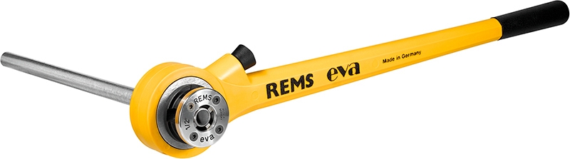Ручной резьбонарезной клупп Rems Eva Set NPT 3/8"-1/2"-3/4"-1"-1 1/4"-1 1/2"-2" (Ремс Ева Сет НПТ 3/8"-1/2"-3/4"-1"-1 1/4"-1 1/2"-2") предназначен для нарезки правой трубной конической резьбы NPT (Taper Pipe Thread ASME B1.20.1) на стальных трубах Ø 3/8", 1/2", 3/4", 1", 1 1/4", 1 1/2", 2". Rems Ева – резьбонарезной клупп высокого качества для монтажников. Особенно легкий надрез и нарезание резьбы. Храповый рычаг из стали, покрытый пластиком. Всего один тип быстросменных резьбонарезных головок.
