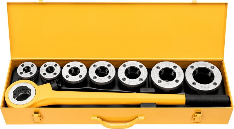 - Rems Eva Set NPT 3/8"-1/2"-3/4"-1"-1 1/4"-1 1/2"-2". Ручной резьбонарезной клупп для трубной резьбы NPT 3/8", 1/2", 3/4", 1", 1 1/4", 1 1/2", 2". Для правой резьбы. Один храповый рычаг для всего рабочего диапазона. Быстросменные резьбонарезные головки и плашки для правой трубной конической резьбы Taper Pipe Thread ASME B1.20.1 NPT 3/8", 1/2", 3/4", 1", 1 1/4", 1 1/2", 2". В прочном стальном чемодане.