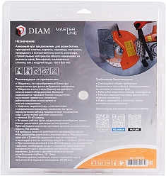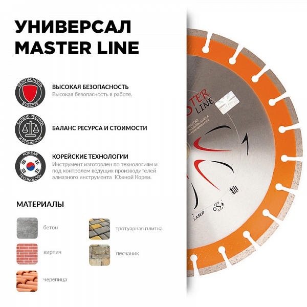 Сегментный алмазный круг Diam Master Line 1A1RSS Универсал 300 мм (Диам Мастер Лайн 1А1РСС Универсал 300 мм) – специальный алмазный отрезной диск с лазерной сваркой сегментов для сухой и мокрой резки бетона, тротуарной плитки, кирпича, черепицы, песчаника, природного и искусственного камня, строительных материалов общего назначения на системах резки крупноформатной плитки, бензорезах, электрических резчиках и плиткорезах, камнерезных станках, стенорезных машинах, швонарезчиках, с подачей и без подачи воды.