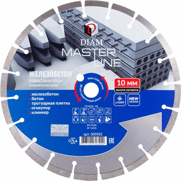 Сегментный алмазный круг Diam Master Line 1A1RSS Железобетон 300 мм (Диам Мастер Лайн 1А1РСС Железобетон 300 мм) – профессиональный алмазный отрезной диск для сухой и мокрой резки бетона, армированного бетона (железобетона), тротуарной плитки, кирпича, клинкера, огнеупоров и других строительных материалов, схожих по характеристикам, на бензорезах, электрических резчиках и плиткорезах, камнерезных станках, стенорезных машинах, швонарезчиках и другом оборудовании, с подачей и без подачи воды.