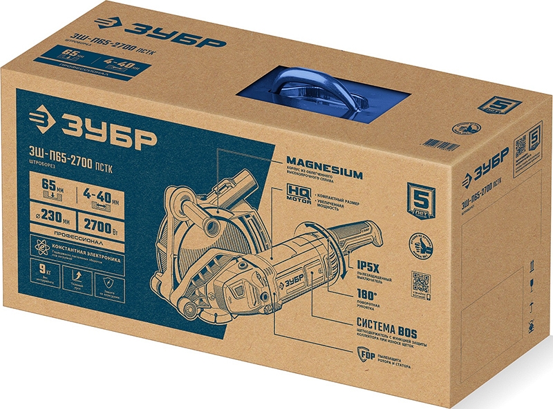 Штроборез Зубр Профессионал ЗШ-П65-2700 ПСТК (Zubr Professional ZSH-P65-2700 PSTK) – лидер в серии профессиональных штроборезов ЗУБР для выполнения штроб в наиболее прочных бетонах. Максимально возможная мощность, широкие пределы глубины (до 65 мм) и ширины реза, полный набор электронных вспомогательных и защитных систем, высочайший уровень надежности, эргономичная и антивибрационная конструкция – максимум возможностей для Ваших задач. Расширенная комплектация с фирменным кейсом для хранения и переноски.